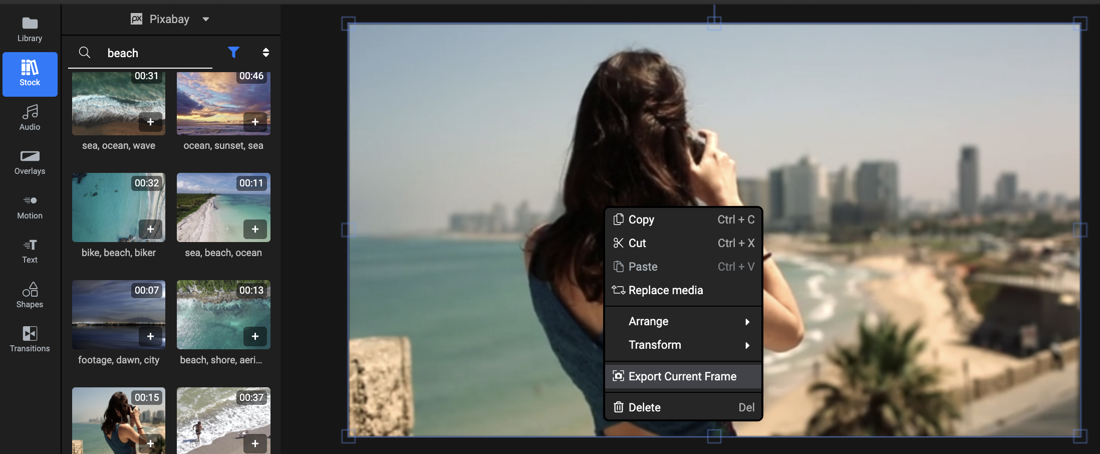 Get a snapshot of your video and use it anywhere you want. Just right click the canvas and select "Export Current Frame".